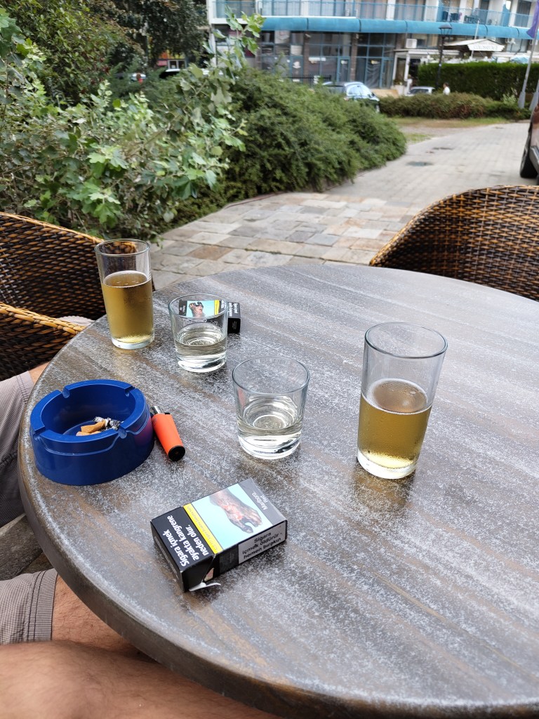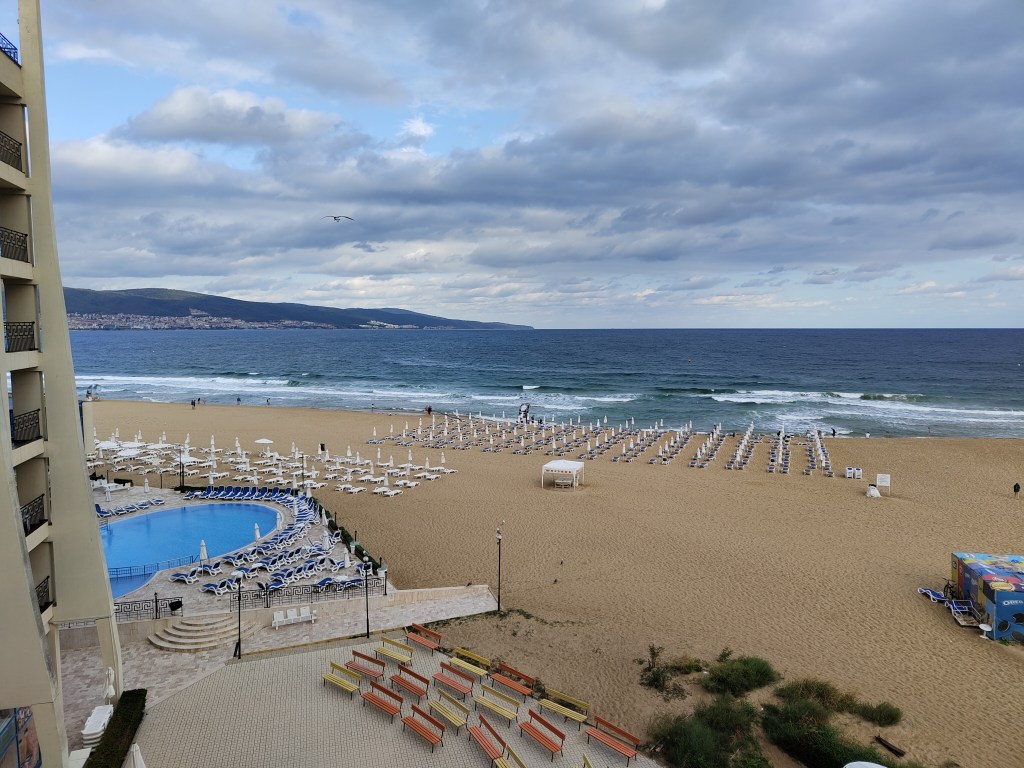 Die Straßen in Bulgarien haben sich bis auf vereinzelte Splitanhäufungen in Kurvenrändern fast heimisch angefühlt. Der Weg zum Sonnenstrand ging daraufhin recht unspektakulär schnell und bis auf ein paar Tropfen zum Abkühlen war nichts Erwähnenswertes. Dort angekommen stellten wir fest, dass unser Hotel bereits im Winterschlaf war, also wurde Booking.com kontaktiert und in der Zeit, wo ich versuchte das zu klären, kam ein Mitarbeiter des Hotels zu uns und rief direkt seine Managerin an, welche uns direkt ein kostenloses Hotelzimmer direkt am Meer mit Meerblick anbot. Im Hotel Viand angekommen wurden also das Zimmer bezogen und das Meer angesteuert. Vorher allerdings wurde noch ein Stopp an der Hotelbar eingelegt, ist ja All-Inclusive 😉.